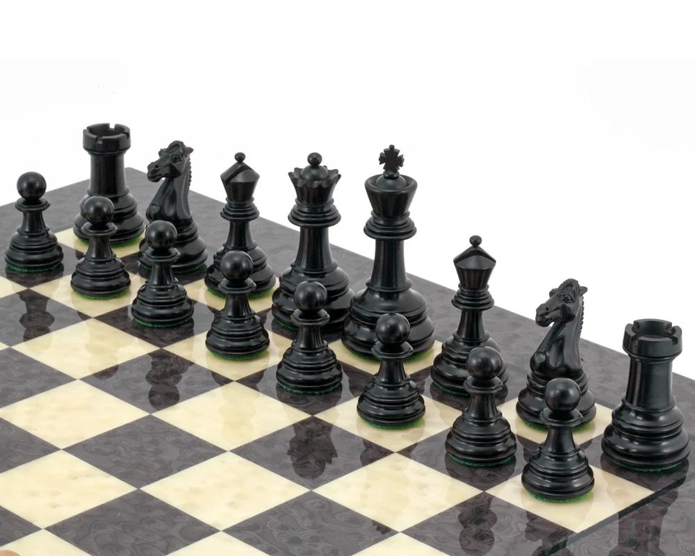 This Cheltenham Series chess set combines painstakingly hand turned ebony and boxwood chess pieces with a 20 inch grey briar wood and elm wood chess board. The board is made in Italy to the highest standards and has a mesmerising burr chequerboard finish. Coated in a quality gloss lacquer, the chess pieces reflect majestically in the light.