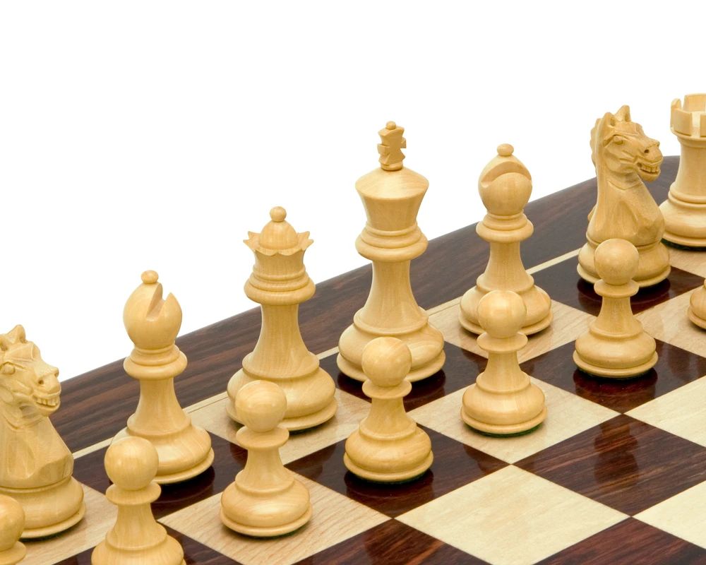 Outstanding quality and form for the price, the new Fierce Knight series chessmen in ebonised Boxwood and natural Boxwood are hard to fault. The pieces are carefully packaged within a purpose built black flock lined wooden chess piece case, perfect for stowing away these stunning pieces when not in use. The pieces themselves are styled on the Staunton look with the Knight having a particular charismatic demeanor. The Fierce Knight Chessmen will accompany any of our 16 Inch dark wood playing boards.