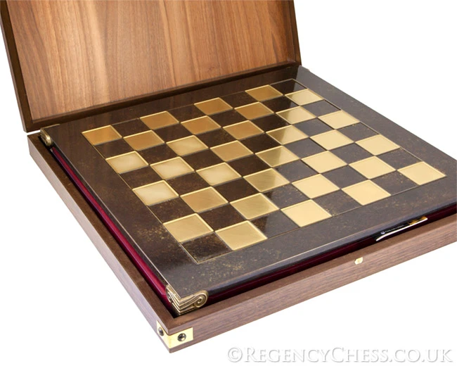 Beautifully finished large Greek-Roman Army metal chess set presented in a wooden cabinet. The chess pieces are made from brass and nickel plated metal pieces. The detail is excellent and features the Emperor or King, his Queen, Centurions or Officers and Infantry or foot soldiers. The rook is a classic ancient civilisation pillar and the knight a Steed mounted Standard Bearer.