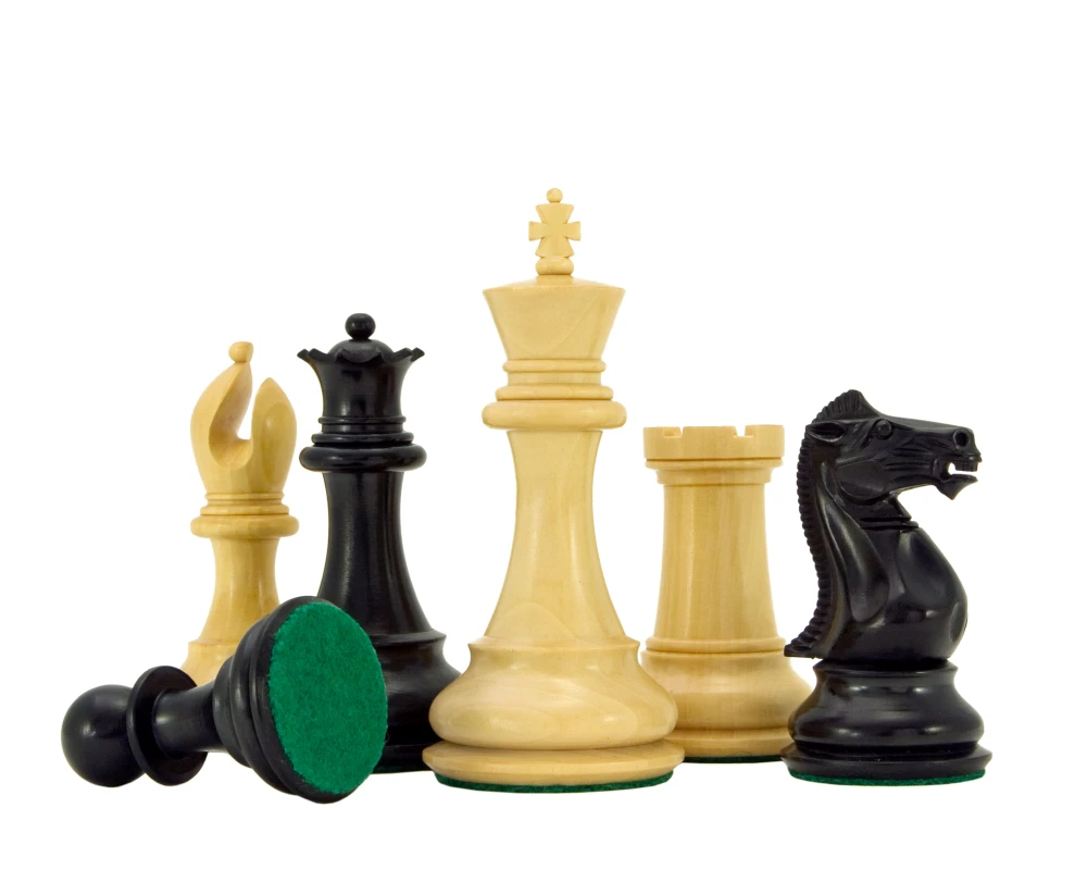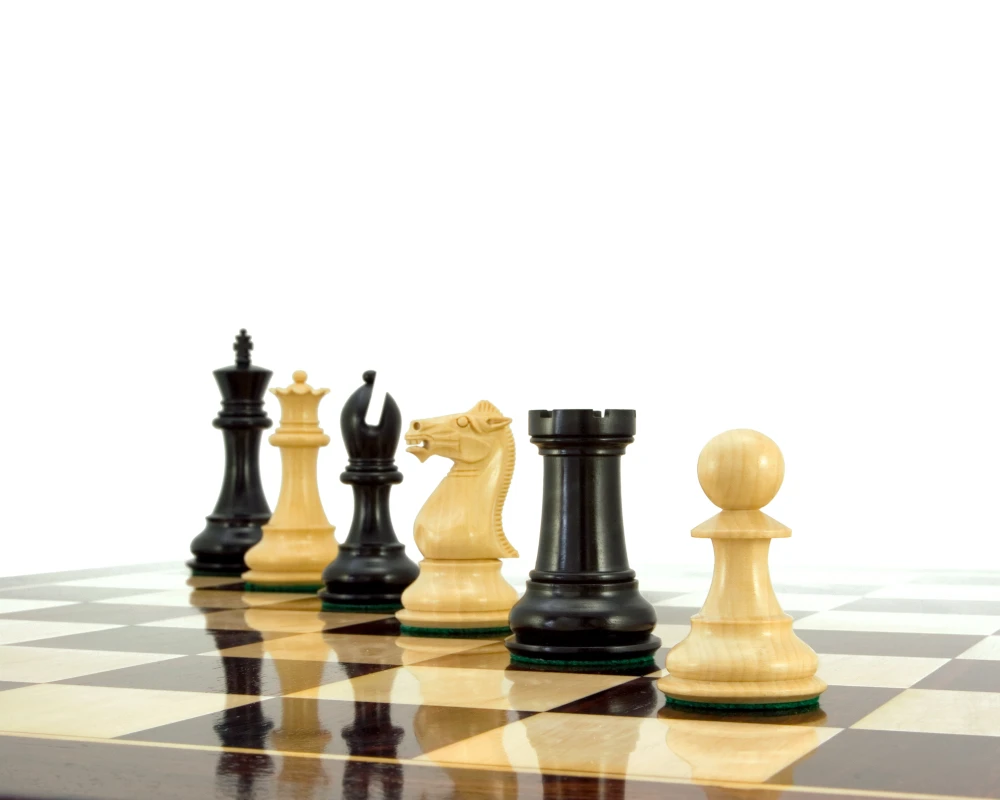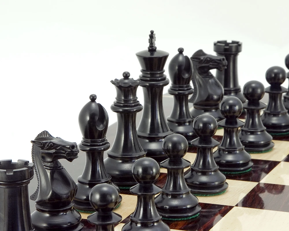 The knights are full of serious and stern facial expressions. While they are not overly ornate they retain the classic Staunton pattern and, most importantly, variation between them is kept to an absolute minimum. These fine chessmen feature a four inch (102 mm) king and are ideal for any of our dark wood 23 inch (60 cm) chess boards. With its 2.5 inch squares, the Montgoy Palisander and Maple Deluxe Board will be particularly suitable for these lovely pieces. If you are looking for unsurpassed quality and a classic Staunton design then the Sandringham Series chessmen should certainly be on your list. The graded black ebony chessmen have been polished to a smooth, uniform, natural sheen. The density of this luxury wood lends itself so well to these fine luxury chess pieces. The sets are produced in very limited quantities and each one comes numbered and certified as a genuine Regency Chess Company product. An investment grade set that will increase in value mainly due to its quantity of high grade ebony wood and its unsurpassed quality and design.