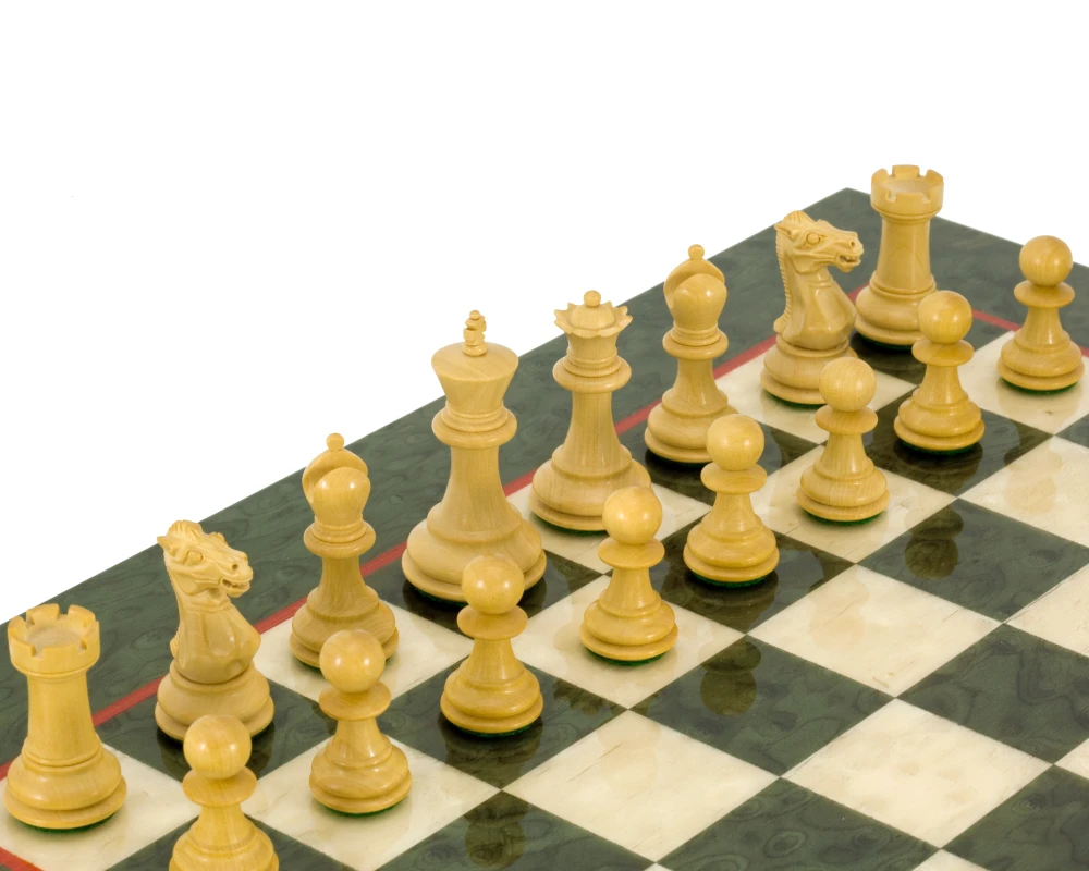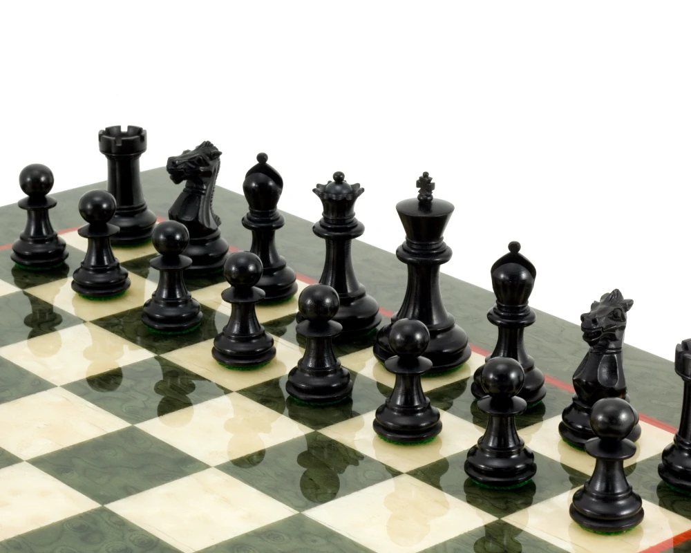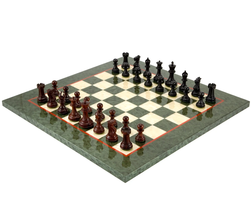 Our Sandringham Tres Corone 2.5 inch (63 mm) Chessmen fashioned in three graded hardwoods – red sandalwood, ebony and boxwood – are matched with this beautiful Italian chess board finished in olive erable burl and maple.