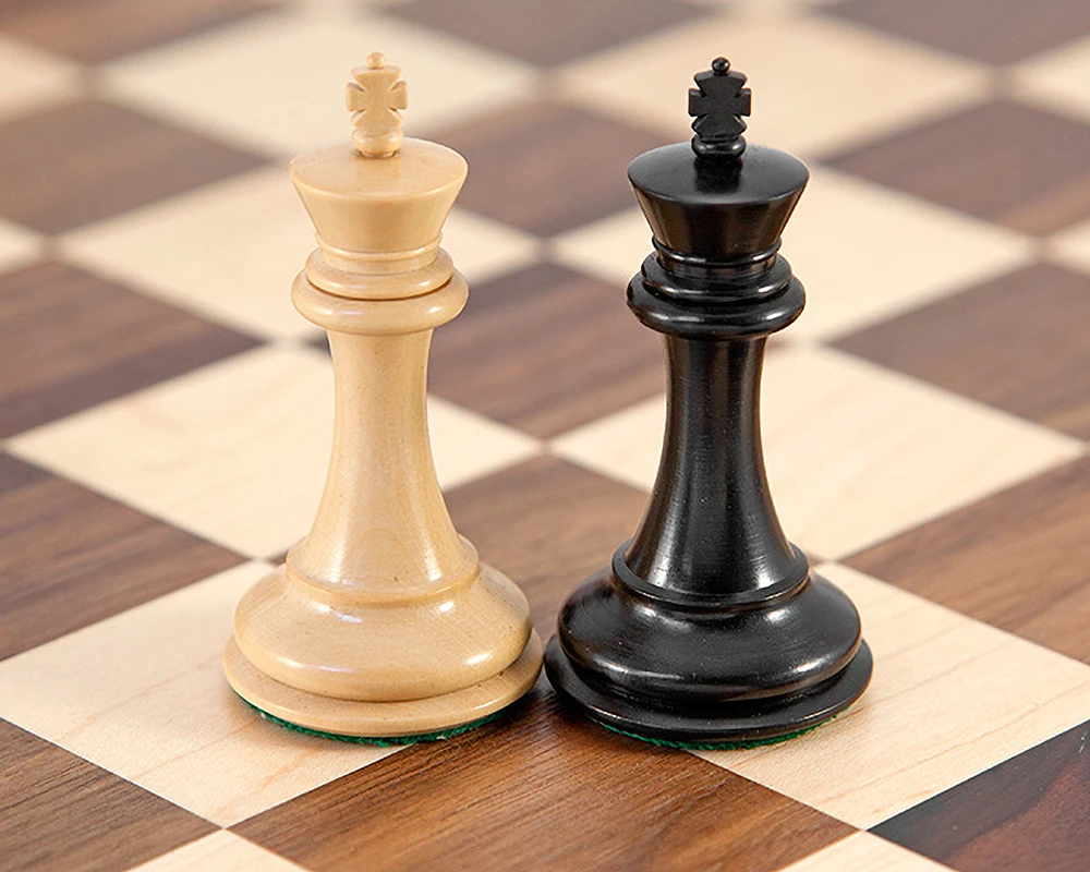 Wonderful luxury Ebonised Staunton chessmen with a traditional Walnut and Maple Chess board. The Sovereign series chess pieces are finished to the finest grade available. The sweeping elegance of the shanks and the flared coronet of the queen can’t help but impress. At 3 inches in height, these chessmen are relatively compact but retain the attention to detail you would expect from a much larger luxury chess piece.