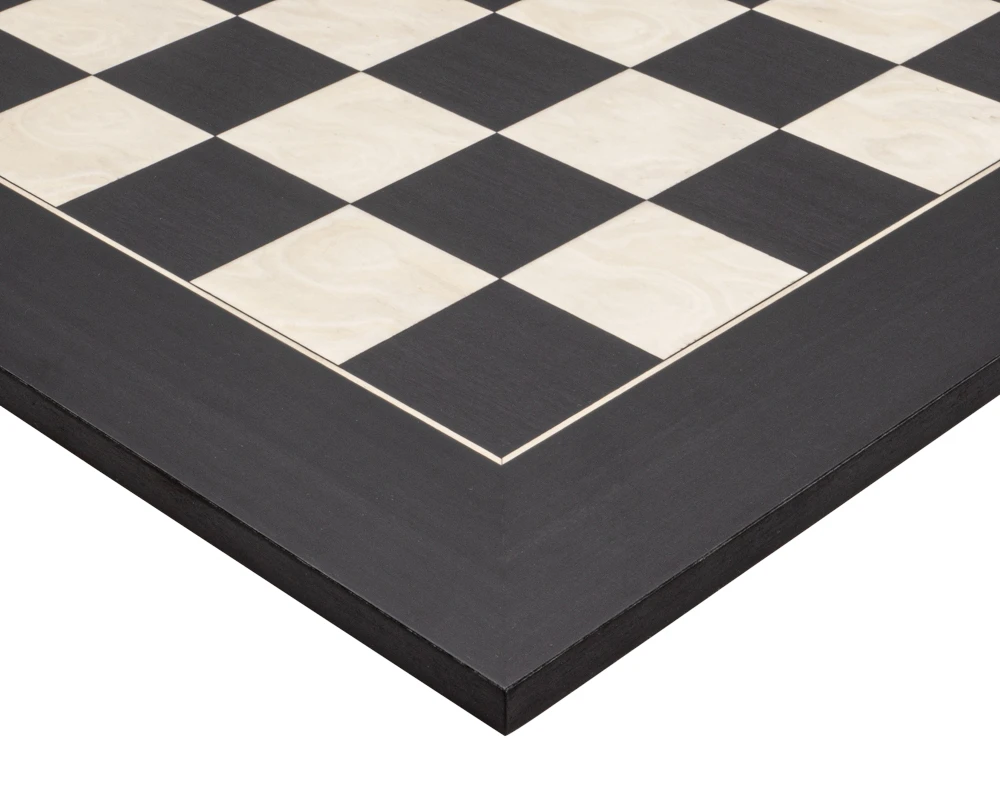 For the king’s height and broad base in this set, these lovely chess men have been matched with a quality 23.6 inch (60 cm) black printed light maple chess board, produced by chess artisans Rechapados Ferrer S.A. of Spain. Using only high grade veneers in its construction and using modern fabrication techniques, this has produced a simplistic contemporary design with sharp contrasting lines and critical detailing. The jet black squares checkered with the extra light maple is simply seductive. A beautifully veneered grey wood base adds the finishing touch. Perfect for accompanying these imposing chess pieces to create a wonderfully timeless chess set.