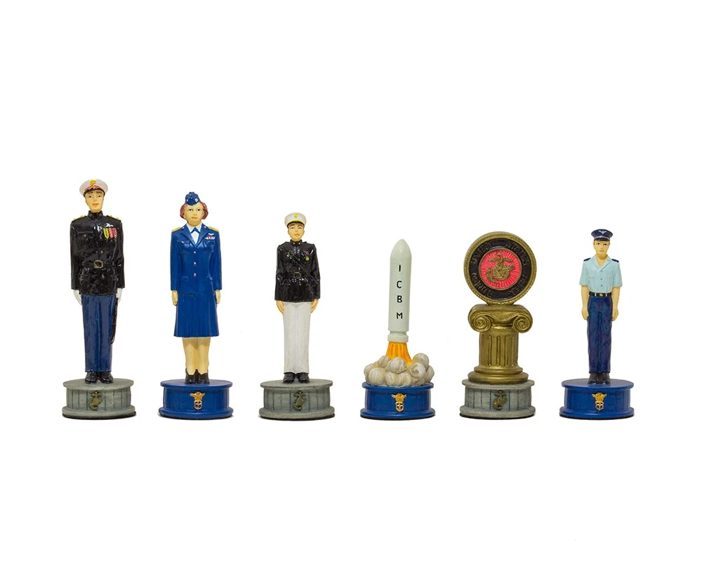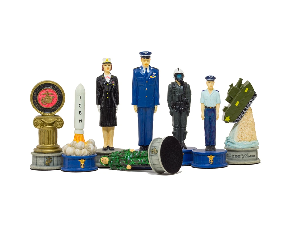 The Air Force is led by a fine upstanding 4 star General supported by a female 4 star General. Both are smartly adorned in blue uniforms adorned with medals. The bishop is a fighter pilot with superb detail in the helmet, mask and breathing apparatus. The rook is striking, depicted by a rocket blasting off, complete with flame and billowing smoke. The Rook is represented by the emblem of The Department of the Air Force of the USA mounted on a scrolled column. Smartly dressed Air Force personnel make up the pawns in this contingent.
