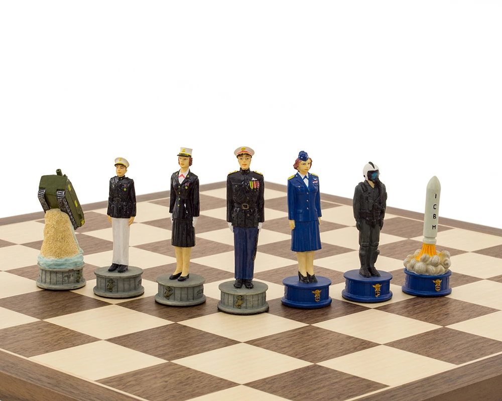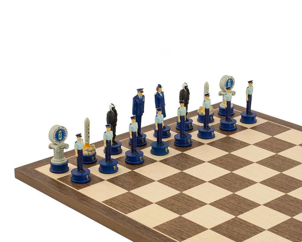 For these outstanding chess men, we would recommend a board of approximately 16 inches. Our 15.75 inch Walnut and Maple Chess Board matches these pieces beautifully to make up The Air Force vs Marines Hand Painted Themed Chess Set.