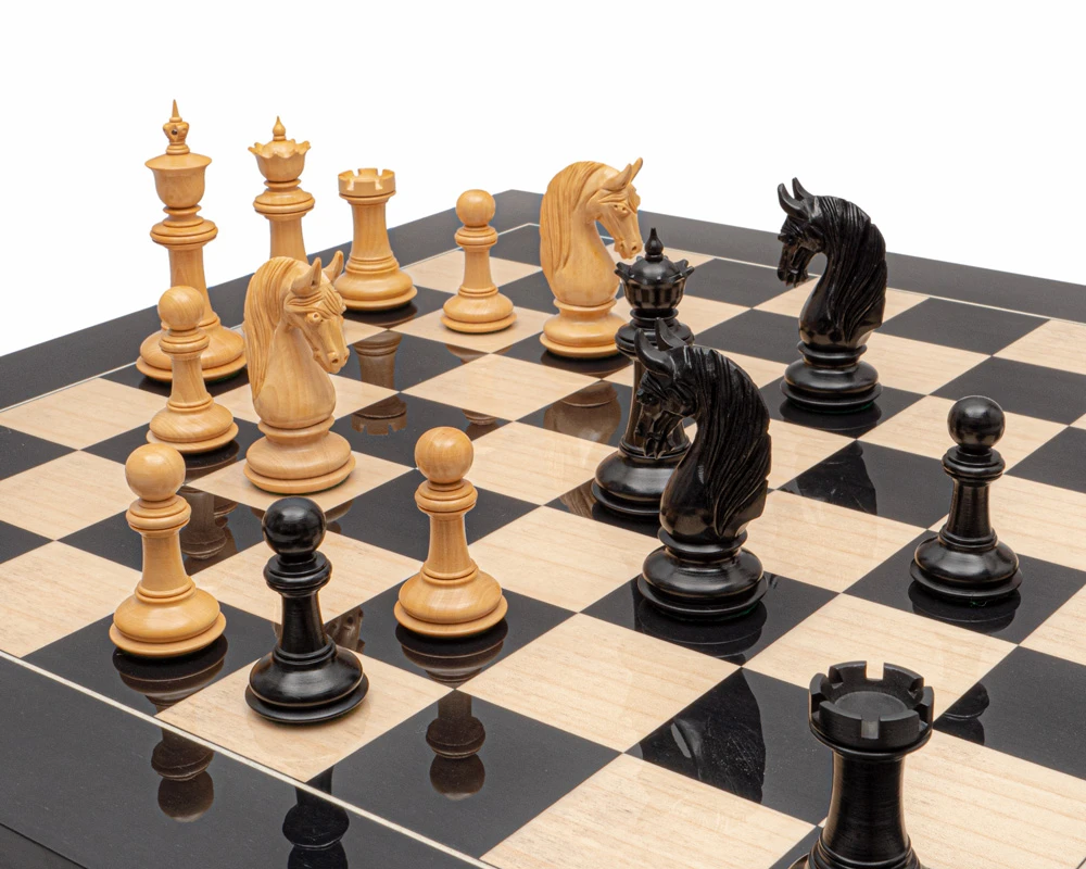 These stunning chess men deserve nothing less than a stunning battlefield and we have matched them with a beautiful creation crafted from black anegre and maple. This board is a commissioned design made by Rechapados Ferrer S.A. of Spain and is of a high grade veneer construction using beautiful jet black anegre around the border and for the dark squares of the board with light maple wood being used for the lighter squares . The board is then finished in a rich deep gloss lacquer creating a chess playing surface with the deepest of blacks. At 23.6 inches (60 cm) in width and with a square size of 60 mm, this deluxe chess board is substantial and ideal in size for the larger chess men and creates a wonderfully contemporary and classical chess set.