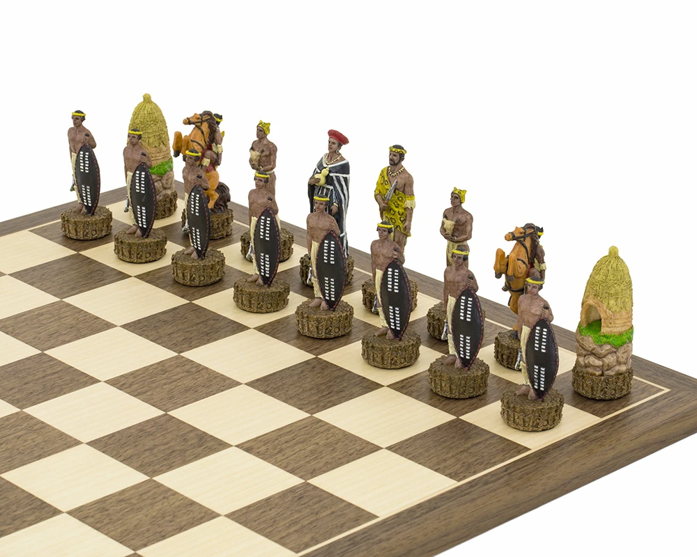 The Zulu pieces are very striking in their detail. The majestic Queen with her flowing robes and urn, the all knowing ‘bishop’ with his cattle skull right through to the pawns and their beautifully decorated shields. Portraying the Zulu rooks as dwelling huts is pure brilliance.