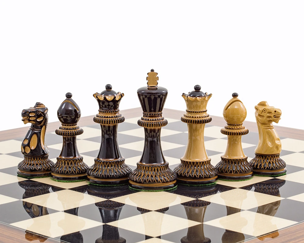 It’s as if our 20 inch (50 cm) Black Anegre and Palisander Deluxe Chess Board was created just for these pieces. The dark and golden tones, achieved by burning the boxwood prior to carving, are complemented by the similar tones in the beautiful high gloss Spanish board.