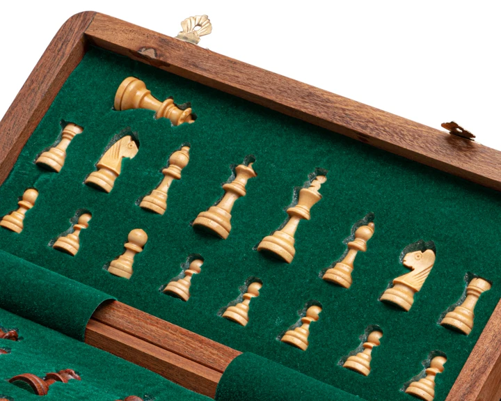 This beautifully made magnetic chess set features a folding clamshell design, and includes a full set of Staunton-style magnetic wooden chessmen. Luxury quality with the convenience of portability.