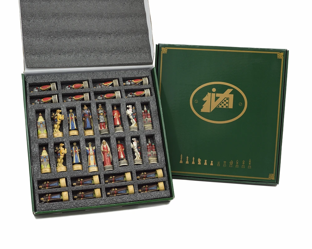 The Russian pieces are typically adorned in traditional costume, from the tall burly King to his elegantly robed Queen and the Cossack styled bishop.